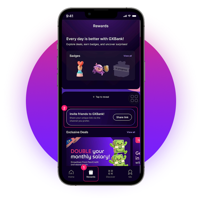 • Go to the GXBank app, look under the “Rewards” tab to locate your link or code.